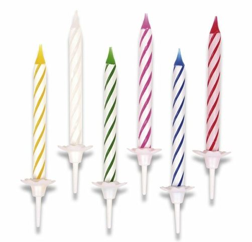 Svíčky na dort, 24 ks a 12 ks stojánků na svíčku.