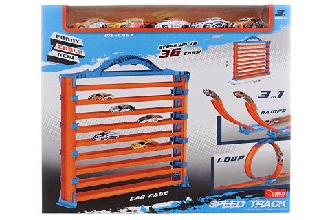 Sada 3v1 - garáž, dráha, rampa. Balení obsahuje 5 autíček. Materiál plast. Baleno v krabici. Rozměry balení 33x28x7 cm. Věk 3+