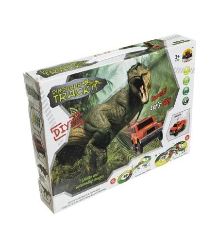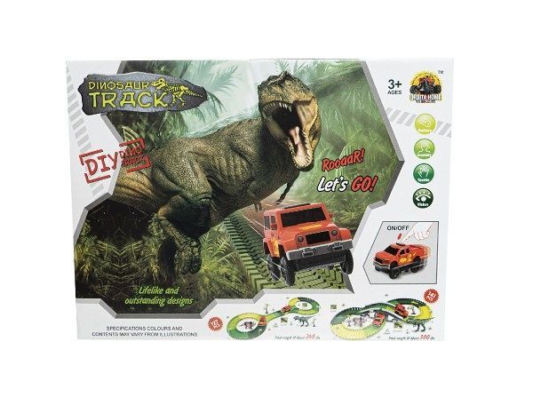 Dráha dino + auto 10x5cm plast 141ks na baterie s doplňky v krabici 35x27x6cm