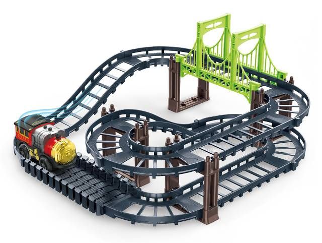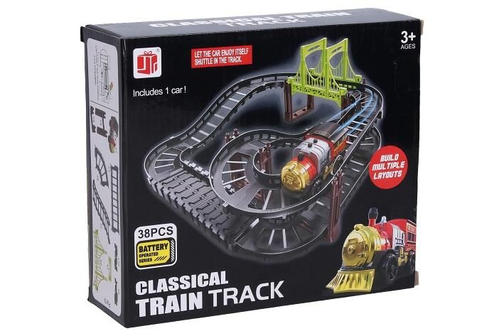 Dráha mašinka. Rozměry dráhy 31x32x14 cm. Aktivace mašinky ON/OFF přepínačem na spodní straně. Pokyny k sestavení na obalu. Baterie 1xAA, nejsou součástí. Sada obsahuje 38 dílů.