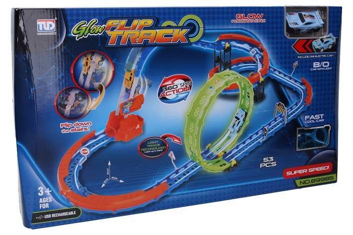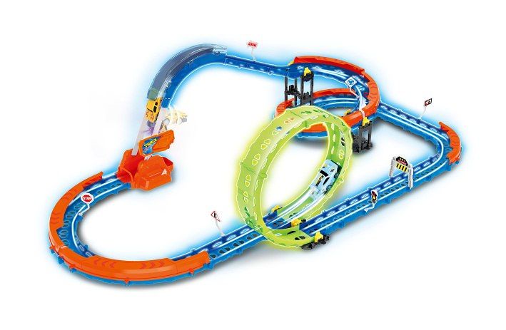 Dráha se svítícím autíčkem. Rozměry sestavené dráhy 88x27x48 cm. Auto - vestavěná 3,7V 90Mah Lithiová baterie, USB nabíjecí kabel je součástí balení. ON/OFF přepínač a nabíjecí port na spodní straně auta.