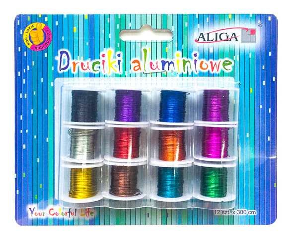 Balení obsahuje 12 barev hliníkových drátků na špulce. Každý drátek má 0,3 mm x 3 m.