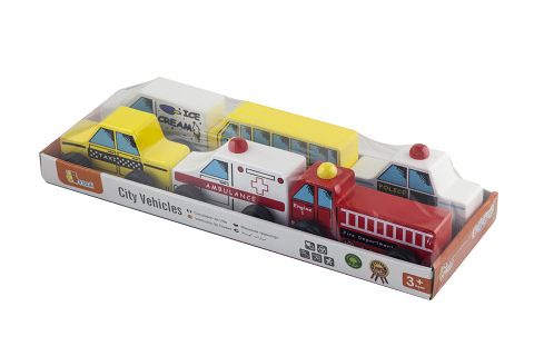 Sada 6 ks dřevěných autíček - autobus školní,policie,zmrzlinové auto,taxi,požární auto,ambulance.Rozměry auta cca 10 x 6 x 3 cm (dle druhu). Rozměry balení cca 32,5 x 6 x 11,5 cm. Věk 18m+