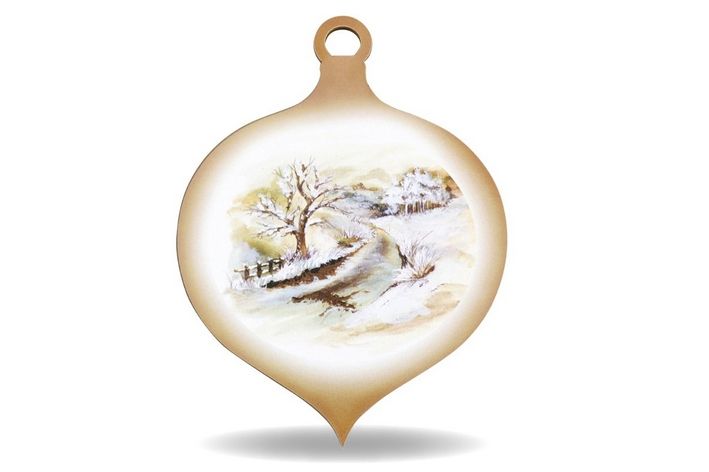 dřevěná dekorace ve tvaru kapky, s potištěným zimním motivem
