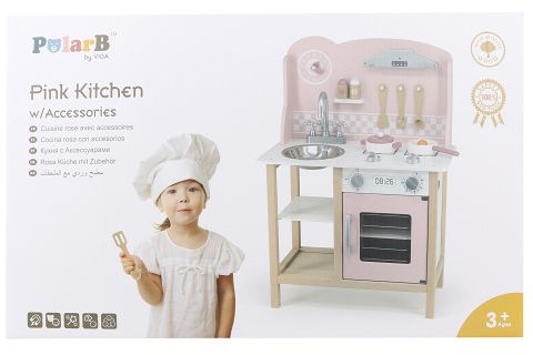 Dřevěná kuchyňka s doplňky o rozměru 60 x 81 x 30 cm. Balení obsahuje dřez, sporák, troubu, skříňku, hodiny a další doplňky. Rozměr balení cca 60 x 37,5 x 16,5 cm Věk 3+