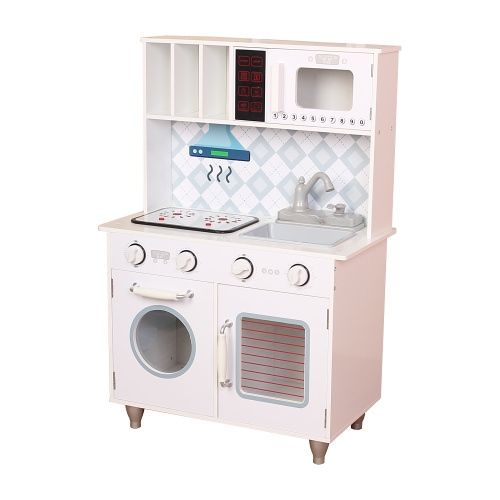 Dřevěná kuchyňka s příslušenstvím. Se zvukovými a světelnými efekty. Mikrovlnka, vařič a kohoutek na vodu. Rozměry ve složeném stavu 57,5 x 29,5 x 84,5 cm. Obrázkový návod na složení v balení.