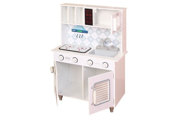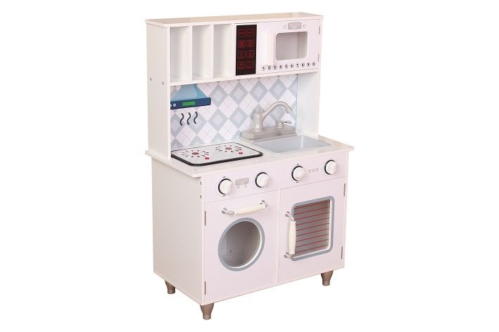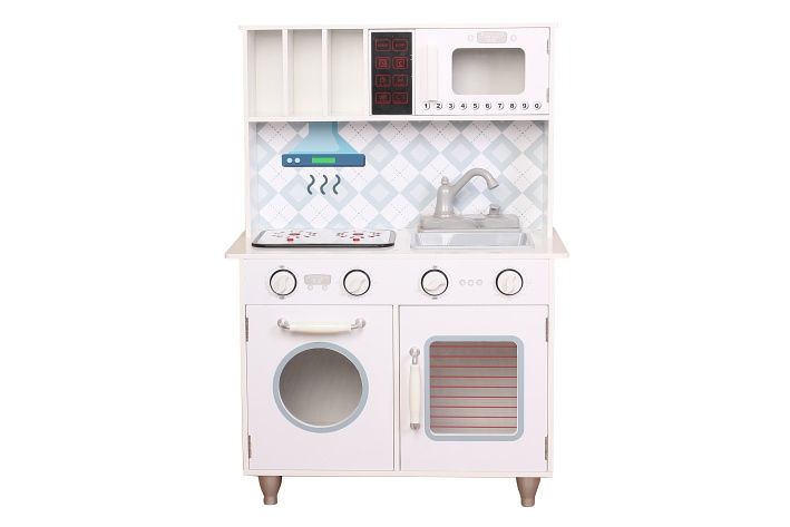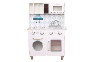 Dřevěná kuchyňka s příslušenstvím. Se zvukovými a světelnými efekty. Mikrovlnka, vařič a kohoutek na vodu. Rozměry ve složeném stavu 57,5 x 29,5 x 84,5 cm. Obrázkový návod na složení v balení.