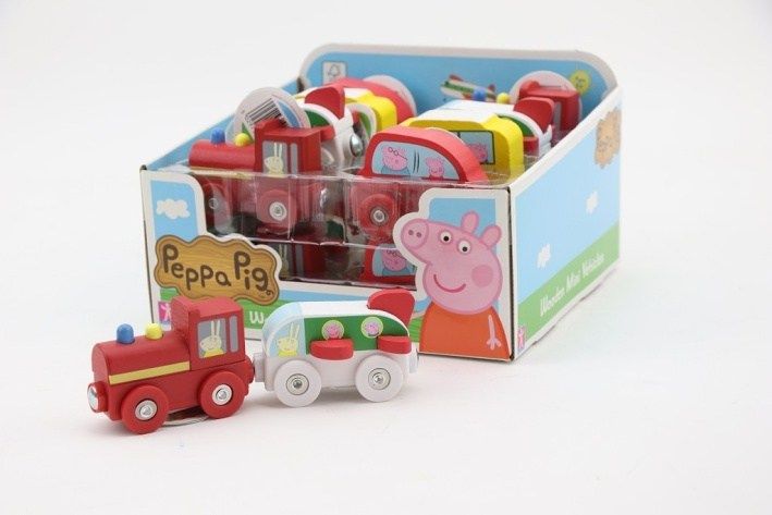 Dřevěná lokomotiva s vagónkem Prasátko Peppa – kolečka lokomotivy jsou rotační. Hračka je ze přední i zadní strany opatřena magnety, díky kterým je možné spojit více vozidel dohromady.Tři různé typy vagonků.