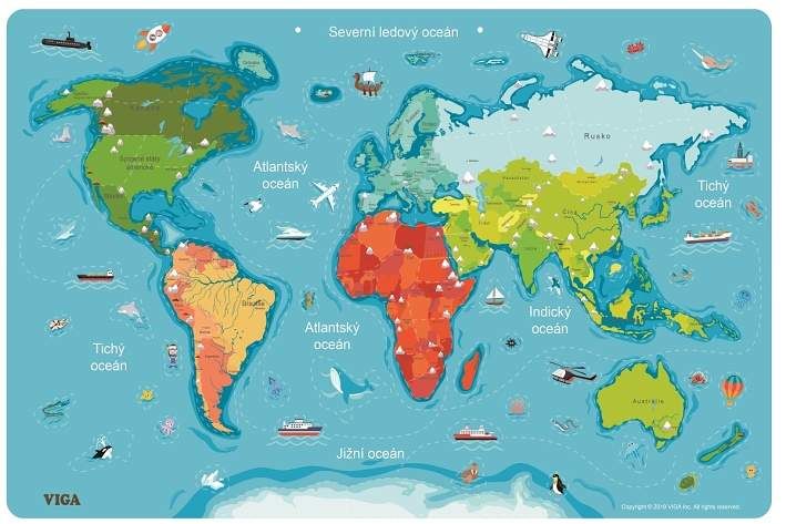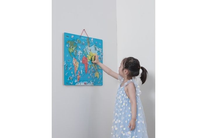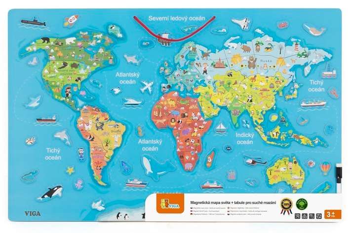 Dřevěná mapa světa s tabulí v českém jazyce. Mapa obsahuje mnoho magnetický dílků. Hraj si a poznávej všechny kouty světa. Druhá strana mapy slouží jako tabule na kreslení a psaní. Rozměry cca 72 x 46 x 0,7 cm. Věk 3+