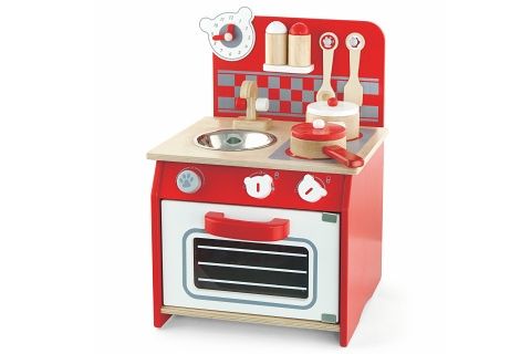 Tato dřevěná mini kuchyňka obsahuje sporák, troubu, dřez a hodiny. Hodiny mají pohyblivé ručičky. Součástí balení je vařečka, naběračka, hrnec s poklicí, pánev s poklicí a 2 kořenky. Rozměry cca 42 x 30,5 x 23,5 cm. Věk 3+