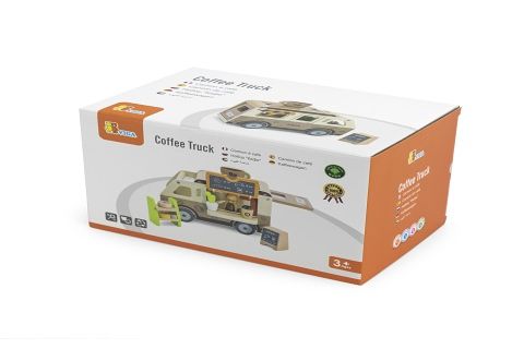 Dřevěná pojízdná kavárna. Balení obsahuje auto, panáčka, ceduli, květinu, kelímek a stojan s dortíky-vše ze dřeva. Rozměry 19x11,8x15 cm. Rozměry balení cca 23,5x15x15 cm. Věk 3+