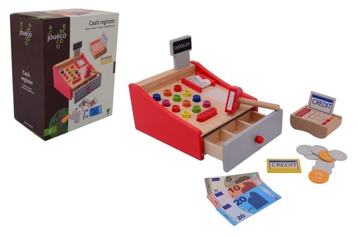 Dřevěná pokladna s příslušenstvím – obsahuje pokladnu, termínál na platební karty, platební karty. Vyrobeno z kvalitního tvrdého dřeva.