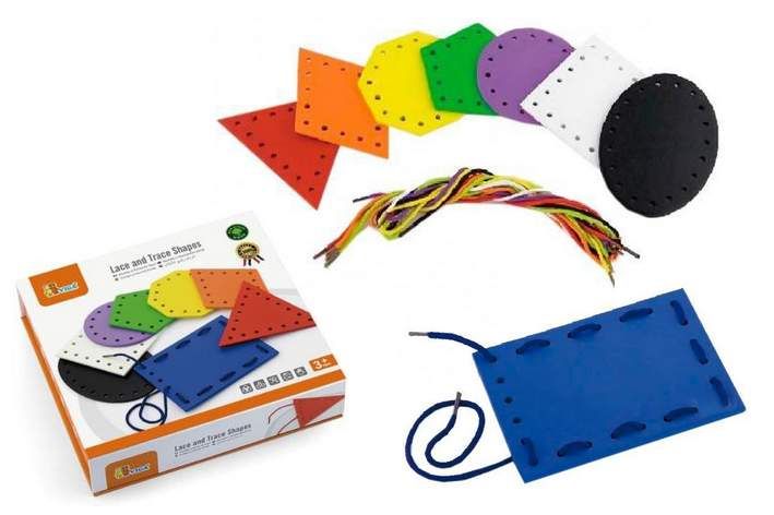 Dřevěná provlékačka. Obsahuje barevné dřevěné tvary a barevné provázky. Baleno v krabičce, která slouží jako úschovný box.