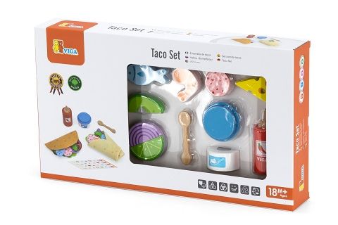 Dřevěná sada obsahuje celkem 27 kusů na přípravu tacos pokrmu.Rozměry balení cca 42,5 x 24,5 x 7 cm. Věk 18m+