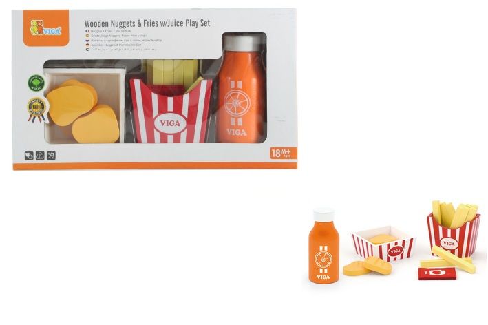 VIGA Dřevěná sada jídlo 16 x 28 x 5,5 cm. Krásně barevná dřevěná sada jídla obsahuje džus, hranolky v krabičce, nugety v mističce a kečup. Imitace jídla, které vypadá jako opravdové! Oblíbená hračka našich nejmenších. Naservíruj si, na co máš chuť.