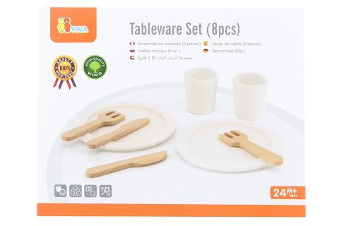 Sada dřevěného nádobí obsahuje 2 talíře o průměru 15,5 cm, 2 hrníčky o rozměru 5 x 6 a 2x příbory. Rozměr balení cca 20 x 16 x 6 cm. Věk 2+