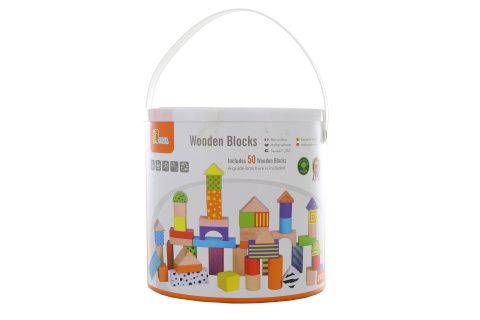 Dřevěná stavebnice v kyblíku. Obsahuje 50 dílků a obrázkovou brožuru s návody na stavění. Rozměry balení cca 18 x 17,5 cm. Velikost kostek 2,5 - 7,5 cm dle druhu. Věk 2+