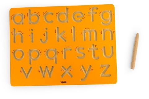 Dřevěná tabulka s vyznačenými písmeny. Děti se mohou jednoduchým způsobem učit psaní písmenek. Na tabulce jsou vyznačené i směry a počty tahů, které by měly děti udělat. Součástí balení je dřevěná tužka-ukazovátko. Rozměry desky cca 30x22x1 cm. Věk 3+