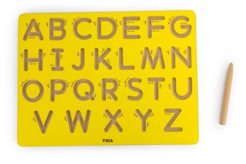Dřevěná tabulka s vyznačenými písmeny. Děti se mohou jednoduchým způsobem učit psaní písmenek. Na tabulce jsou vyznačené i směry a počty tahů, které by měly děti udělat. Součástí balení je dřevěná tužka-ukazovátko. Rozměry desky cca 30x22x1 cm. Věk 3+