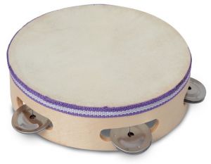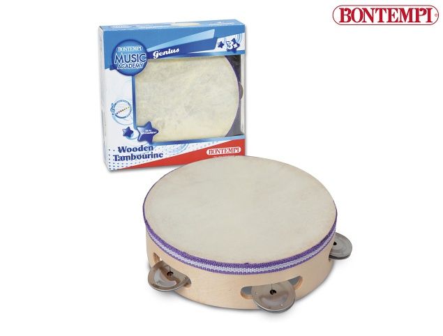 Tamburína s dřevěnou konstrukcí • Přírodní membrána • Činely • Rozměr: 190x45x190 mm