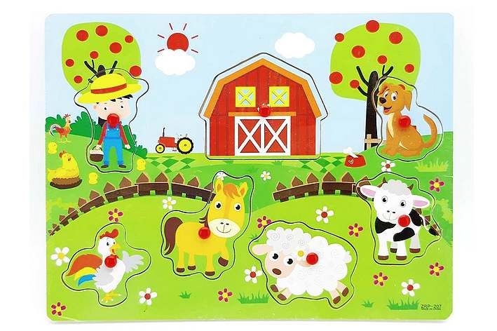 Dřevěná vkládačka se zvířátky na farmě, ve které si děti mohou zkusit přiřadit správné dílky do připravených výřezů.