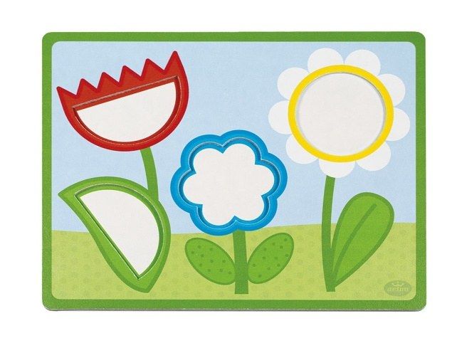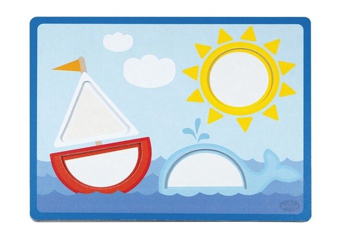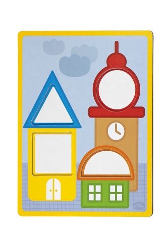 Dřevěná vkládačka se skládá z 6 papírových předloch a 15 dřevěnách hracích kamenů různýct tvarů a barev. Dítko se tak učí jednoduchým geometrických tvarům, přiřazování a rozpoznávání barev.