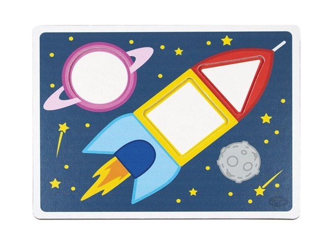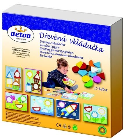 Dřevěná vkládačka se skládá z 6 papírových předloch a 15 dřevěnách hracích kamenů různýct tvarů a barev. Dítko se tak učí jednoduchým geometrických tvarům, přiřazování a rozpoznávání barev.