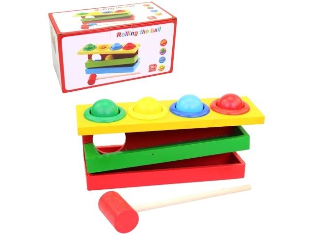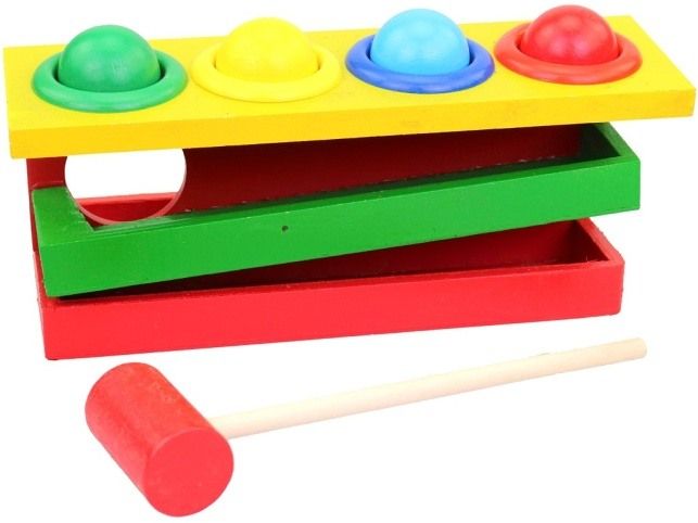 Dřevěná zatloukačka, 20 x 8 x 8,5 cm. Je velmi oblíbenou a zábavnou hračkou. Můžete si s dítětem zahrát a zábavnou formou ho učit barvy. Zvolte si jednu ze čtyř barev, kterou má dítě trefit kladívkem a uvidíte jak rychle dítě začne barvy rozeznávat. Kulička sjede po skluzavce dolů a poté ji můžete umístit zase zpět do otvoru. Hračka je určena pro děti 3+. Rozměr hračky je 20 x 8 x 8,5 cm. Materiál hračky je dřevo. Balení hračky je box. Produkt je určený pro kohokoliv.