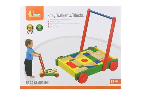 Dřevěné chodítko s kostakmi. Balení obsahuje 36 dřevěných kostek v různých barvách. Rozměry cca 41 x 32,5 x 46 cm. Rozměry balení cca 41,5 x 34 x 9 cm. Věk 12m+