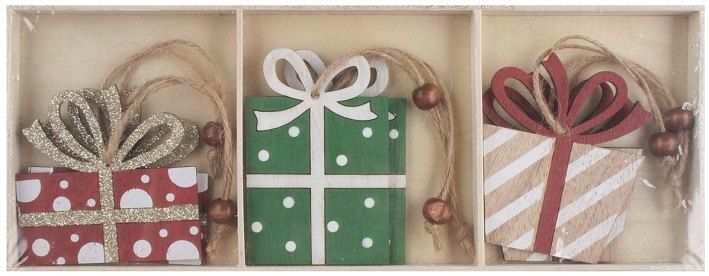 Dřevěné dárky na zavěšení barevné 8 cm, 6 ks v krabičce