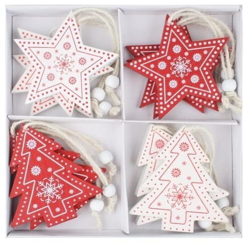 Dřevěné dekorace na zavěšení 8 cm, 12 ks v krabičce
