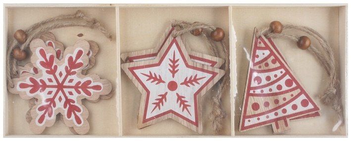 Dřevěné dekorace na zavěšení 8 cm, 6 ks v krabičce