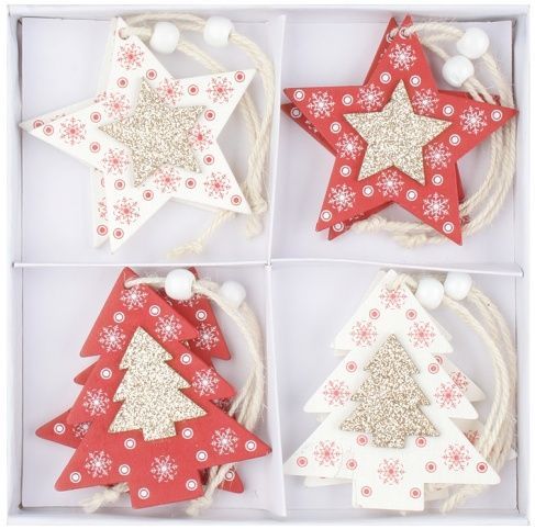 Dřevěné dekorace v krabičce na zavěšení s glitrem Dekorace využijete k dekorování věnců, vazeb, dárků nebo je můžete jednoduše zavěsit třeba na vánoční stromeček. 8 kusů v balení, motiv stromečku a hvězdičky, v červeném a bílém provedení.
