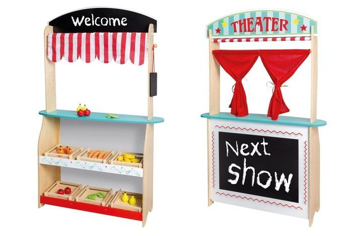 Dřevěné divadýlko/tržnice 2v1. Z jedné strany divadlo z druhé strany