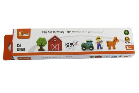 Dřevěné doplňky z farmy - balení obsahuje 7 ks - strom,domek,traktor,farmáře a 2 zvířátka - kravičku a koně o 5,5 x 5 x 1 cm ( nejmeší díl ) , 6 x 7 x1 cm ( největší díl). Rozměry balení cca 34 x 7,5 x 3,5 cm. Věk 3+