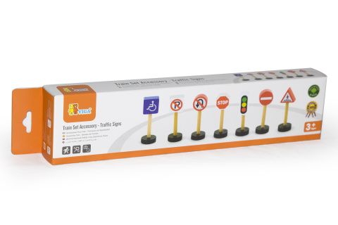 Dřevěné dopravní značky o rozměru cca 7,5 cm. Obsahuje 7 dílků. Rozměry balení cca 34 x 3,5 x 7,5 cm. Věk 3+