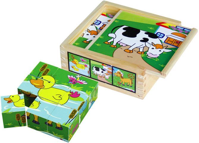 Dřevěné kostky – kubus – 9 kusů v krabičce. Motivy domácích