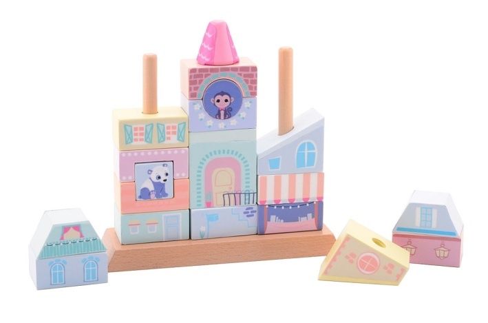Dřevěné kostky se stojánkem. Sada obsahuje kostky na stavbu domečku