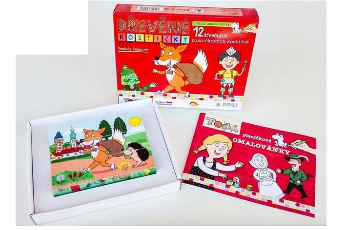 Písničkové kostičky – 6 kostiček pro nejmenší. Balení kostiček navíc obsahuje krásné omalovánky od Venduly Hegerové a texty lidových písniček, které jsou vyobrazeny na kostičkách.