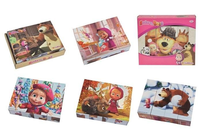 Dřevěné kostky "Máša a medvěd. Obsahuje celkem 12 kostek a 6 motivů. Velikost složeného obrázku 16 x 12 cm.