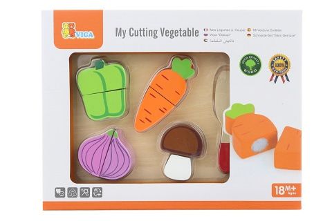 Dřevěné krájení zeleniny. Balení obsahuje 4 druhy zeleniny, prkénko a nůž. Rozměry balení cca 27,5 x 21 x 3,5 cm. Věk 18m+