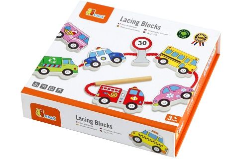 Dřevěné navlékání dopravních prostředků. Obsahuje 12 dřevěných bloků a 1 navlékací provázek. Baleno v krabičce, která slouží jako úschovný box. Rozměry balení cca 21 x 19 x 4,5 cm. Věk 24m+