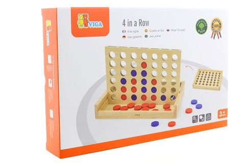 Dřevěné piškvorky. Cílem je seřadit vedle sebe 4 dílky stejné barvy. Rozměry hry 29,3x19x18,5. Rzměry balení 30x19x5 cm. Věk 3+