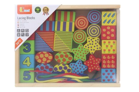 Dřevěná provlékačka. Obsahuje barevné dřevěné tvary a barevné provázky. Baleno v krabičce, která slouží jako úschovný box. Rozměry balení cca 25,5 x 20 x 5,5 cm. Věk 3+