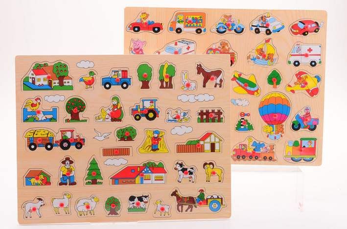 Dřevěné puzzle s úchytem pro nejmenší. 2 různé druhy – na farmě