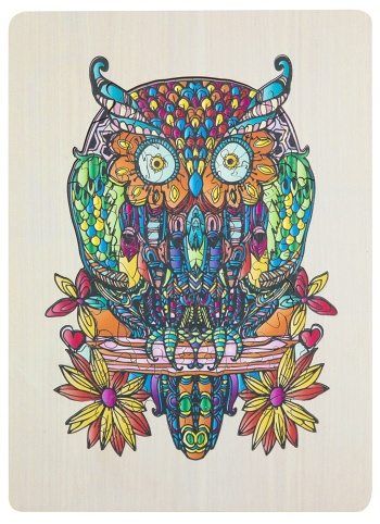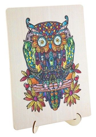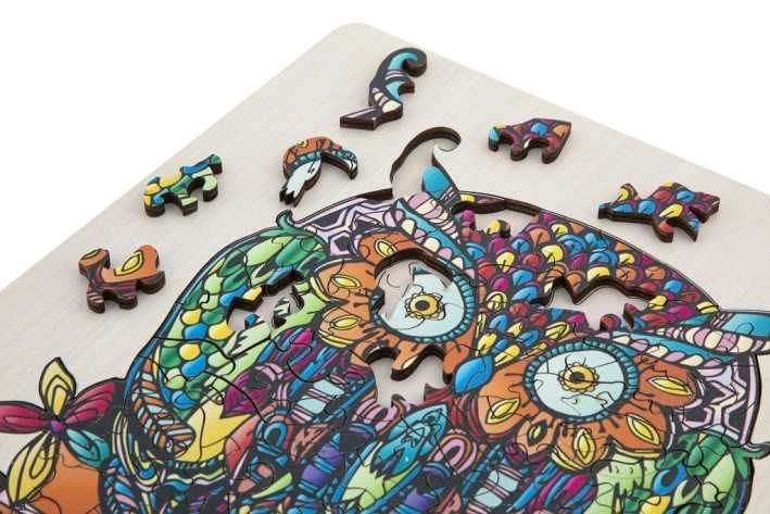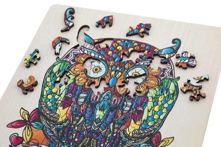Dřevěné mozaikové puzzle se stojánkem v designu Sova. Puzzle se skládají ze 132 jedinečně tvarovaných dílků a složené puzzle lze poté umístit na přiložený dřevěný stojan. Rozměry: 30 × 22 centimetrů. Vhodné od 7 let.