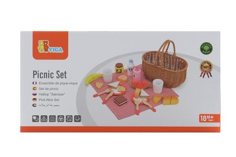 Krásný koš z umělého rákosu je vyplněný dřevěnou sadou doplňků a kostkovanou látkou. Díky bytelným madlům si vaše dítě snadno vezme celou sadu s sebou, kamkoli půjde. Sada se skládá z 30 prvků. Rozměr košíku cca 25 x 23,5 x 14,5 cm. Rozměr balení cca 28 x 14 x 16 cm. Věk 18m+