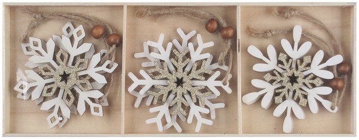 Dřevěné vločky na zavěšení 8 cm, 6 ks v krabičce
