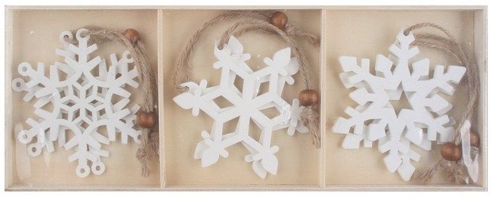 Dřevěné vločky na zavěšení bílé 8 cm, 6 ks v krabičce