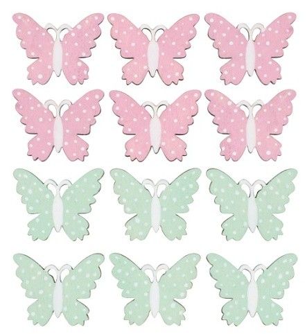 Dřevění motýlci s lepíkem Motýlky využijete k dekorování věnců, vazeb, dárků či přáníček. Jedná se o univerzální dekoraci, kterou můžete použít v průběhu celého roku. 12 kusů v sáčku, mix barev.